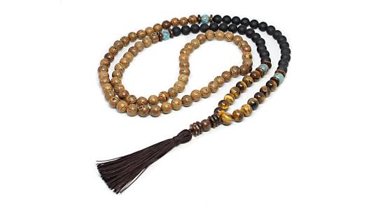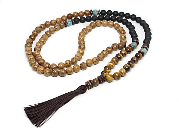 Mala drevený náhrdelník doplnený o kamene: Tigrie oko, Ónyx a modrý Achát s hnedým strapcom je tradičným mala náhrdelníkom s 108 kusmi korálok.