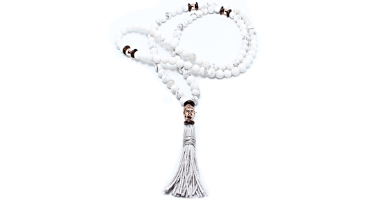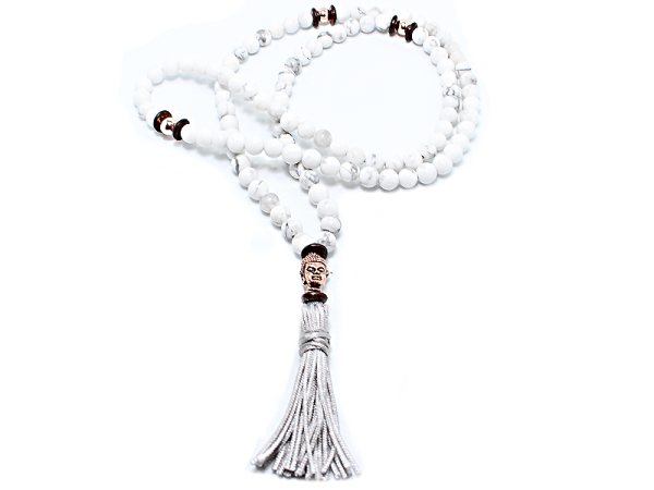 MALA náhrdelník je vyrobený v kombinácii kameňov biely Howlit a Hematit ružovej farby / cca 6 mm / doplnený Buddhom a dlhým strapcom, je vyrobený zo 108 korálok, pri dotyku každej korálky sa odriekava mantra alebo naša vlastná meditácia, afirmácia, či slová povzbudzujúce našu energiu, na ktorú sa chceme sústrediť a priniesť ju do života.