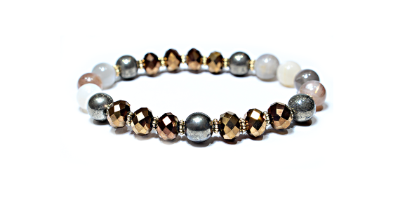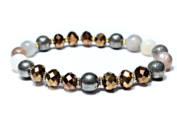 Náramok v kombinácií kameňov Pyrit, Mesačný kameň, Krištáľ.
